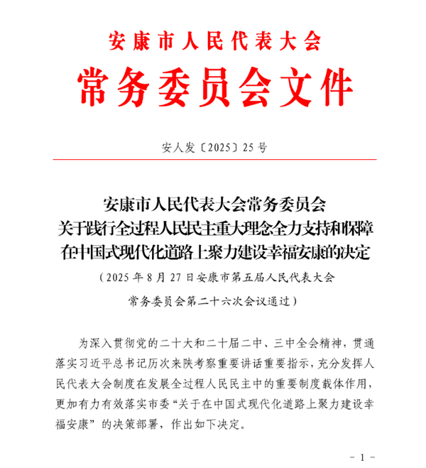 本網訊(通訊員 周清華 張凡)8月27日,安康市五屆人大常委會第二十六次會議作出《安康市人民代表大會常務委員會關于踐行全過程人民民主重大理念全力支持和保障在中國式現代化道路上聚力建設幸福安康的決定》(以下簡稱《決定》),并自印發之日起實施。以地方人大常委會作出重大事項決定的形式,將黨的主張通過法定程序轉化為全體人民的共同意愿,是安康市人大常委會強化擔當、依法履職的創新實踐,是圍繞中心、服務大局的務實舉措,必將為在中國式現代化道路上聚力建設幸福安康注入堅實的人大力量。u8n安康新聞網