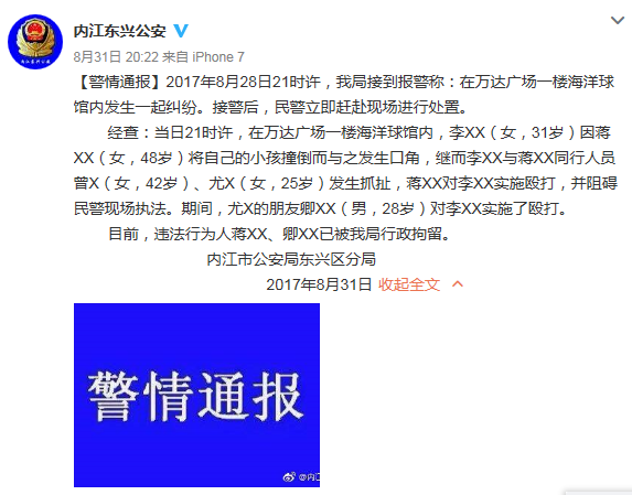 據(jù)8月31日內江東興公安發(fā)布的警情通報稱,網(wǎng)傳視頻記錄的實為2017年8月28日發(fā)生在四川內江萬達廣場的一起糾紛。8月28日21時許,警方接到報警稱:在萬達廣場一樓海洋球館內發(fā)生一起糾紛。接警后,民警立即趕赴現(xiàn)場進行處置。經查,當日21時許,在萬達廣場一樓海洋球館內,李某某(女,31歲)因蔣某某(女,48歲)將自己的小孩撞倒而與之發(fā)生口角,繼而李某某與蔣某某同行人員曾某(女,42歲)、尤某(女,25歲)發(fā)生抓扯,蔣某某對李某某實施毆打,并阻礙民警現(xiàn)場執(zhí)法。期間,尤某的朋友卿某某(男,28歲)對李某某實施了毆打。隨后,違法行為人蔣某某、卿某某被內江公安行政拘留。