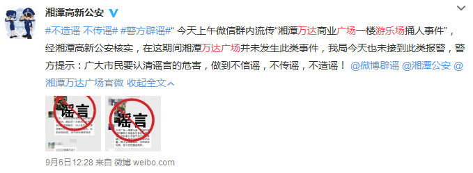 “求真”欄目記者發(fā)現(xiàn),不止湖北黃石,湖南湘潭、益陽以及山東煙臺都曾傳出“萬達廣場發(fā)生打架捅人事件”的消息,各地網(wǎng)警都進行了辟謠。9月6日,湘潭高新公安通過官方微博表示,“經核實,湘潭萬達廣場并未發(fā)生網(wǎng)傳的‘游樂場捅人事件’,警方也未接到此類報警”。