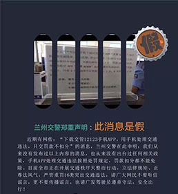 9月14日,蘭州交警通過官方微信公眾號發布澄清聲明:我們從來沒有發布過以上內容的消息,也從來沒有出臺過任何相關政策,手機APP處理交通違法應按照處罰規定,罰款扣分都不能免除。