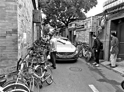 一名在胡同口維持秩序的醫院保安不時會提醒行人,不要將共享單車停放在醫院門口,并幫忙將道路中間的共享單車向兩邊靠攏,為路面留出更多空隙。但隨著人數增多,道路依然不可避免地越來越擠。北青報記者觀察發現,近半個小時的時間里,就有四輛機動車被胡亂停放的單車卡在道路中間,被困車輛甚至連車門都難以打開,只能求助醫院保安或者周圍居民來挪開車旁的共享單車。8點左右,一名ofo小黃車運營人員在接到醫院保安的電話后趕到現場。據他介紹,僅現場的小黃車就需要七八次才能全部搬走,搬出來的單車會被投放在附近其他需要用車的地點,“搬運工作大概會用一上午吧。”