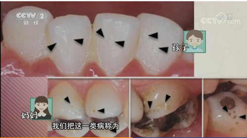 段小紅說:“這個病例的整個牙齒顏色接近正常,但細微觀察,牙齒表面黑色三角指的地方出現(xiàn)一些小的、點窩樣的缺損,這是不正常的,這是孩子的媽媽的情況,從這兩張照片可以看到,小孩牙釉質(zhì)出現(xiàn)的異常是由媽媽這一輩遺傳給他的,我們把這類病稱為遺傳性的釉質(zhì)發(fā)育不全。”