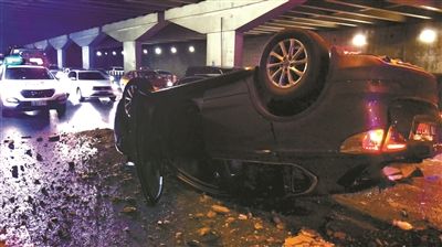 目擊者拍攝的現場照片顯示,這輛黑色小轎車“四腳朝天”摔在農展橋下的三環主路上,車頭及駕駛艙部位受損嚴重,地面上滿是玻璃碎片。農展橋橋面一側的護欄也被破壞,被汽車撞下橋面。