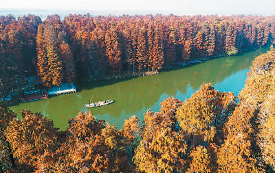 江蘇省興化市水上森林是人工生態林,以“林中有水、水中有魚、林內有鳥、河流回環、杉樹林立”的景觀聞名遐邇,吸引不少游客乘船游覽。