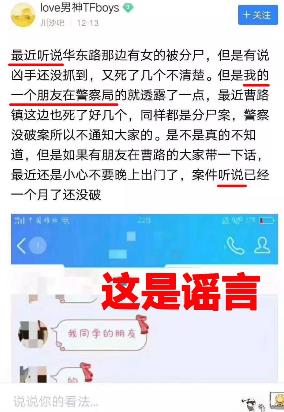 現(xiàn)經(jīng)浦東警方查證,“川沙曹路地區(qū)發(fā)生多起碎尸案”的始發(fā)網(wǎng)民“LOVE男神TFboys”為女中學(xué)生張某。其于12月13日晚與同學(xué)在網(wǎng)上聊天時得知所謂“華東路附近有個女子被分尸,兇手到現(xiàn)在還沒抓住”的消息,未核實該信息的真實性便在百度貼吧內(nèi)發(fā)布了上述內(nèi)容。后張某感覺被騙,遂于12月15日晚刪除該帖。此后有部分網(wǎng)民將其內(nèi)容截圖發(fā)布至新浪微博,造成該謠言進(jìn)一步擴(kuò)散。