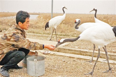 每天上午9點和下午3點,這位40多歲的“迷彩大叔”和鐵桶里的魚都會準時出現。這樣的工作,遼寧省盤錦市鶴類種源繁育基地副站長趙仕偉24年從未間斷!懊圆蚀笫濉焙退耐聜児卜庇苫畹ろ旡Q131只,占國內野生種群的1/5。
