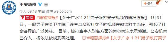 通報中稱,2018年1月31日上午10時許,在廣水市廣水街道辦事處的一家衛生院,一名男子暴力毆打一名女子。事發時,該衛生院領導及時趕到現場勸解制止。廣水市公安局廣水派出所接到報警后,及時出警調查。據警方初步調查,被打女子為該衛生院的一名職工,打人男子系其丈夫,打人事件因家庭矛盾糾紛引發。
