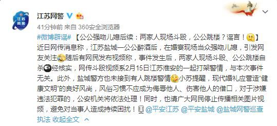 2月26日9時3 3分,江蘇省公安廳網(wǎng)絡(luò)安全保衛(wèi)總隊(duì)官方微博“江蘇網(wǎng)警”對此辟謠,“經(jīng)核實(shí),網(wǎng)傳斗毆視頻系2月15日江蘇淮安的一起打架警情,與本次事件無關(guān)。此外,鹽城警方也未接到有人跳樓警情。”