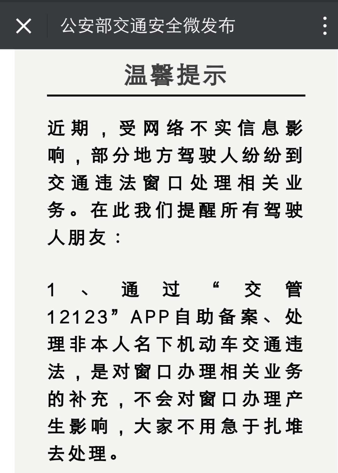 2月26日,公安部交通管理局通過官方微信發(fā)布文章,對新增項(xiàng)目推出后群眾提出的問題進(jìn)行答疑,并提醒駕駛?cè)伺笥逊Q“通過‘交管12123’APP自助備案、處理非本人名下機(jī)動車交通違法,是對窗口辦理相關(guān)業(yè)務(wù)的補(bǔ)充,不會對窗口辦理產(chǎn)生影響,大家不用急于扎堆去處理。”同日,北京交警也通過官方微信辟謠稱“3月1日起,不綁定備案就不能處理非本人名下車輛違法”系誤讀,并提示:在北京市,不通過網(wǎng)上渠道處理非本人名下機(jī)動車交通違法的車主,依然可以通過各交通支、大隊(duì)執(zhí)法站窗口辦理。