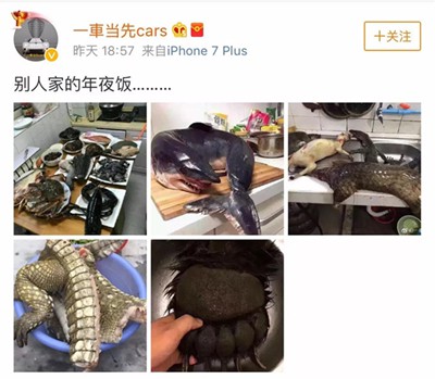 2018年2月15日(除夕)晚7時,微博賬號為“一車當(dāng)先cars”的博主發(fā)布了一條名為“別人家的年夜飯……”的消息,并配發(fā)一組擺放在廚房里待烹制的熊掌、穿山甲、鱷魚等野生動物的照片,引發(fā)了網(wǎng)民的廣泛關(guān)注和大量轉(zhuǎn)發(fā)。