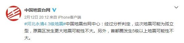 朋友圈內(nèi)傳播一條假冒官方通知的消息稱“檢測局緊急通知,因地殼變動今晚津京冀地區(qū),八點(diǎn)到凌晨六點(diǎn)有間接性地震發(fā)生,3~5級,請大家做好避震準(zhǔn)備以防有危險發(fā)生。檢測局2018.2.12 16點(diǎn)40分通知”。12日20時02分,中國地震臺網(wǎng)官微發(fā)布消息稱,“經(jīng)過分析判定,這次地震可能為孤立型,原震區(qū)發(fā)生更大地震可能性不大。另外,首都圈發(fā)生5級以上地震可能性不大”。并提醒大家“遇到地震傳言時請不信謠、不傳謠!”