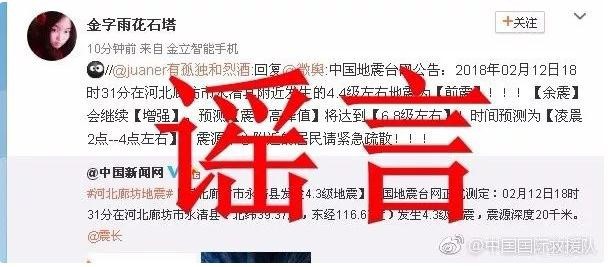 2月12日,河北永清地震發(fā)生不久后,網(wǎng)上有消息稱該縣“9958應(yīng)急救援隊(duì)接到通知,今晚11點(diǎn)30分有余震活動!12日19時57分,河北省廊坊市人民政府新聞辦官微“廊坊發(fā)布”對此辟謠稱,“純屬謠言,公安部門正在追查謠言的源頭,請廣大群眾勿信勿傳謠言,以權(quán)威發(fā)布為準(zhǔn)!