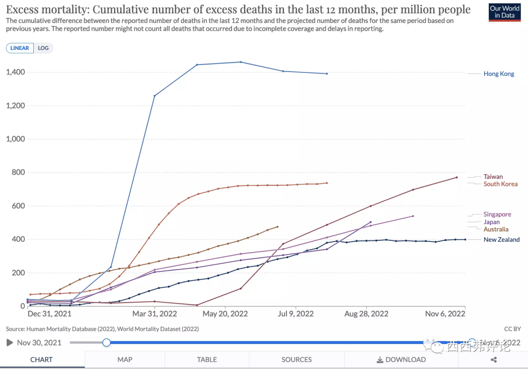 過去十二個(gè)月的累計(jì)超額死亡率,香港飆升到了萬分之十四,臺(tái)灣接近萬分之八,新加坡也超過了萬分之五。目前只有新西蘭,還在萬分之五以下。即使這樣,這幾個(gè)國家或地區(qū)在整個(gè)疫情期間的超額死亡率,仍然遠(yuǎn)遠(yuǎn)低于大部分歐美國家,他們?nèi)匀皇强挂叩膬?yōu)等生。