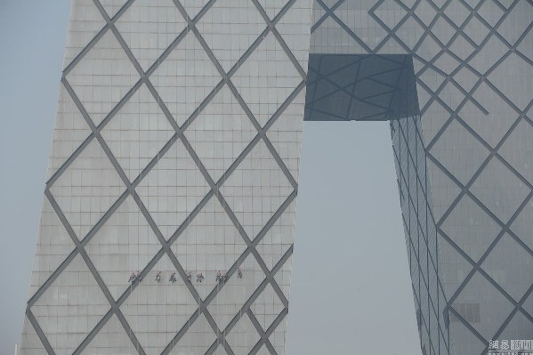 2015年4月9日消息,北京,近日有央視記者發微信說,央視新址大樓正在開始建成以來的首次外里面清洗,清洗費用50萬元人民幣,耗時需要40天。圖為在央視大樓的外吊……