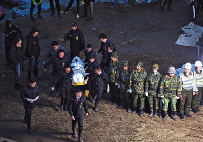 昨日,救援人員將搜尋到的乘客遺體搬上岸。當日,搜救人員在事故現場附近陸續尋獲5名罹難者遺體。仍有3名旅客下落不明。新華社記者 金立旺 攝