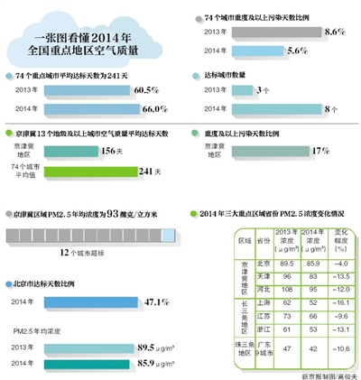 新京報訊 (記者金煜) 環保部昨日公布了去年重點區域和74個城市空氣質量狀況。去年全國PM2.5濃度有了普遍下降,京津冀區域PM2.5年均濃度降到93微克/立方米,雖然……