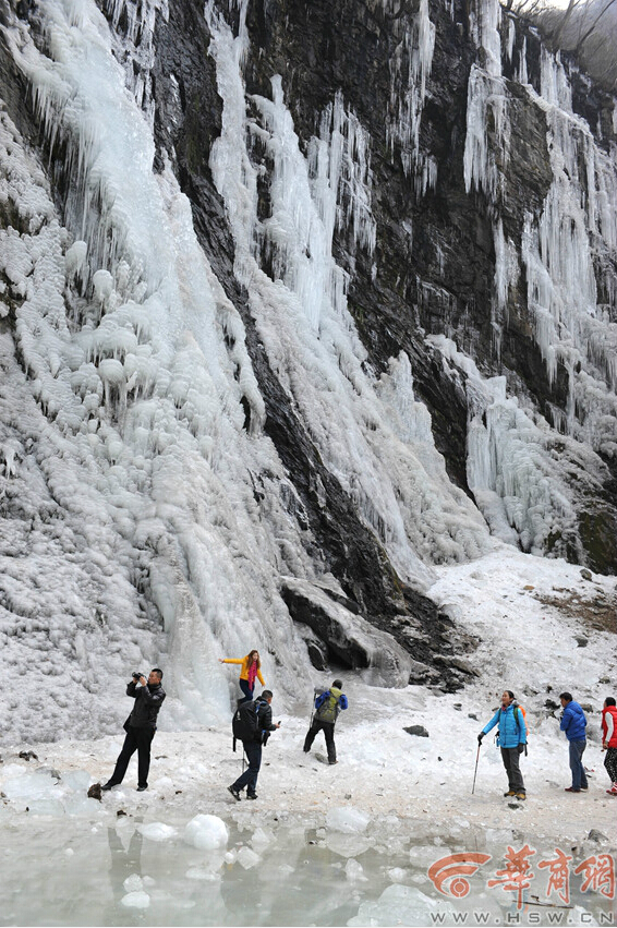 昨日下午2時,游客在戶縣澇峪黑山瀑布前合影留念。不時有冰塊從瀑布上方掉落,著實讓人捏了一把汗 記者 趙彬 攝