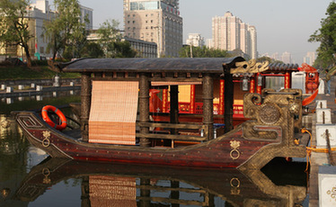 這艘仿古船有十七八米長,船內(nèi)裝飾精美。西部網(wǎng)訊(記者 魏永賢) 4月22日早晨,西安城墻南門西側護城河上停泊著7艘“秦、漢、唐”等不同主題的仿古游船。船舶古……