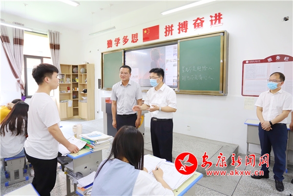 在漢濱高中, 寇全安一行先后檢查了入校檢測點、防疫物資儲備、監控平臺運行等,了解考點參考人數、考場布置,以及食品安全、試卷保密等備考保障措施落實情況,叮囑要壓實各方責任,加強統籌配合,為廣大考生營造安全安靜、舒適舒心的考試環境。在江北高中和漢陰縣第二中學,他走進教室和高考學子交談,勉勵他們保持良好心態,從容備考應考,并祝福考生取得優異成績;還著重了解了學校心理咨詢室運行情況,并就如何開展心理健康教育和預防校園暴力與校長、部分教師進行了交流探討。