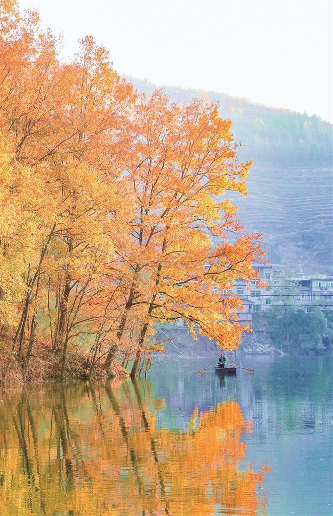 待到霧散天青,沙坪河便展露出它清澈的容顏。兩岸層林盡染,漫山的斑斕都被河水溫柔收納。一川碧水如鏡,完整復(fù)刻出天空與彩林的倒影,虛實(shí)交錯,舟行其上,仿佛滑入一幅靜止的油畫。山偎著水,水映著山,靜謐而又絢爛。